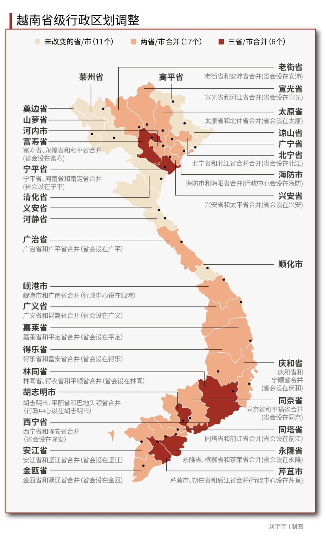 越南国会6月12日表决通过的省级行政单元归拢决议,将寰宇63个省级行政单元精简至34个。越南全境除高平、奠边、河静、莱州、谅山、义安、广宁、清化、山萝等9省和河内、顺化2市原样保留之外,剩余的52个省市进行归拢重组,组建成23个新的省级行政单元。